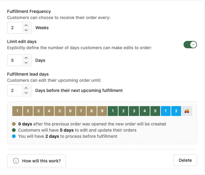 To understand how the subscription features work day to day, it helps to walk through the workflow. When you set up subscriptions in Local Line, you start by enabling them on a price list and defining your fulfillment plans and available frequencies. You can configure how many days before a fulfillment date a draft order converts to an open order (the fulfillment lead time), and whether customers can skip upcoming deliveries or make edits to their orders before a cutoff date.