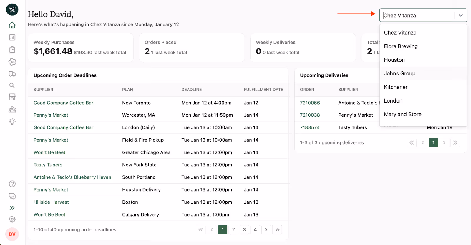 The left side of the homepage shows all your Upcoming Order Deadlines, giving you a clear, chronological view of supplier cutoffs and fulfillment dates. Instead of hunting through supplier lists or calendars, you can immediately see which orders need to be placed and when.